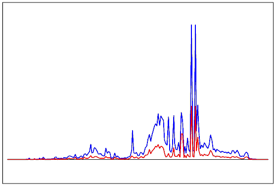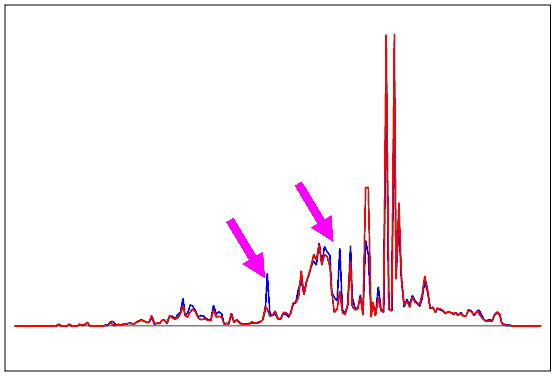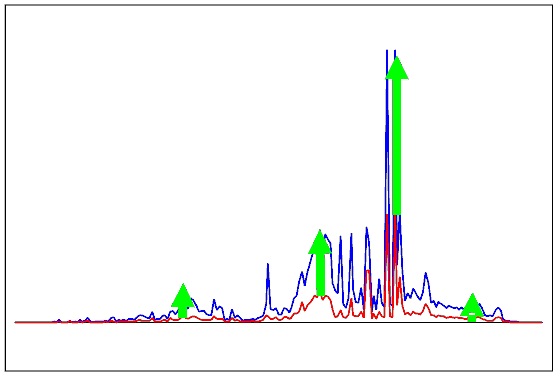 In the figures below, two spectra are shown with different dilutions. The blue spectrum is concentrated by a factor of about 3 resulting in an integral of about three times as high as the red spectrum. Due to the different overall concentrations, both spectra seem to look very different. The integral normalization procedure up-scales the red spectrum by a factor of three to render the areas below the spectrum equal. The third figure shows that besides of the overall dilution both samples are very similar. The two arrows indicate the two parts of the spectra with the most significant differences. These differences are based on relative changes of metabolites and are of interest for metabolic profiling.